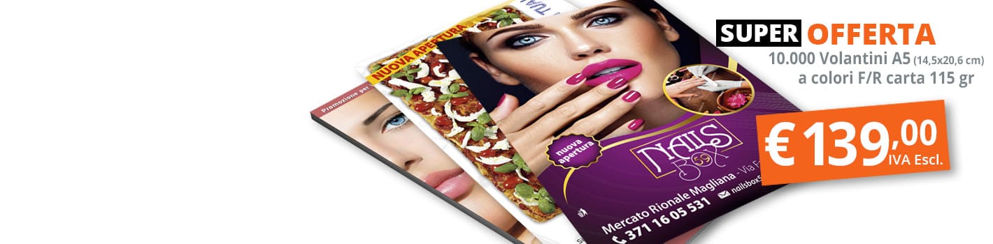 Siamo Tipografia Online al tuo servizio per la realizzazione di prodotti di Stampa, realizzazione grafica e Pubblicità di piccolo, medio e grande formato, come Volantini, Biglietti da Visita, Dépliant e Pieghevoli, Etichette Adesive e tanto altro.